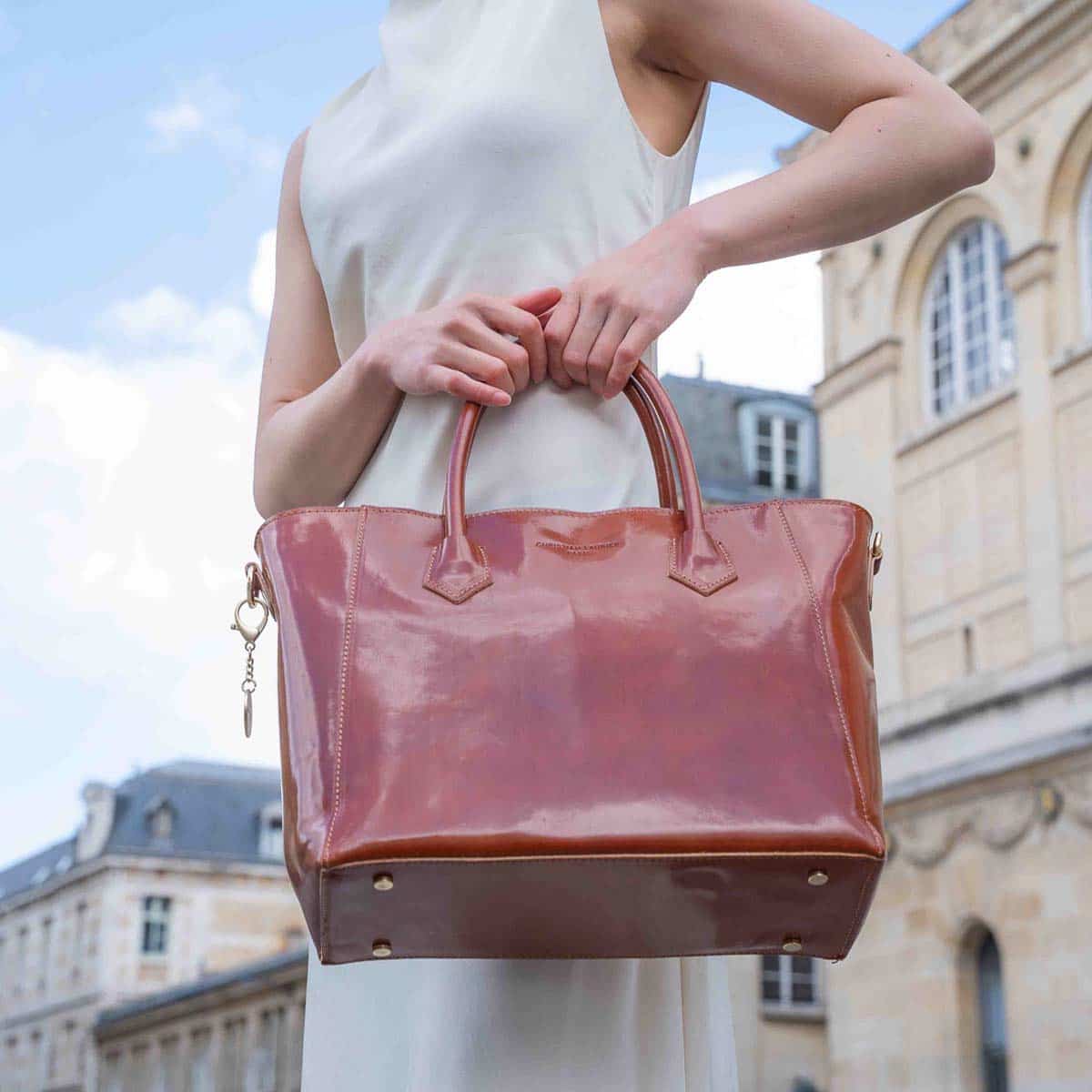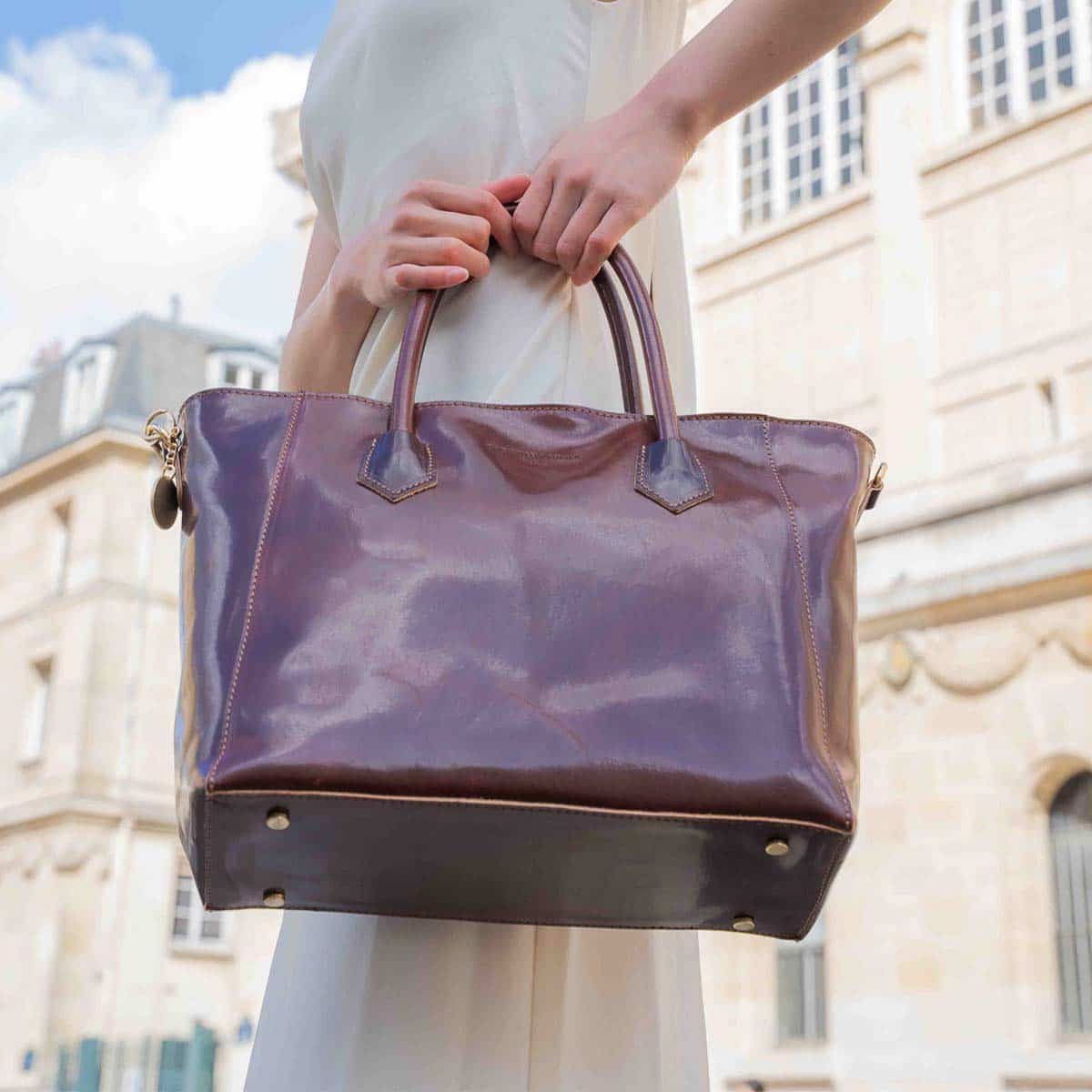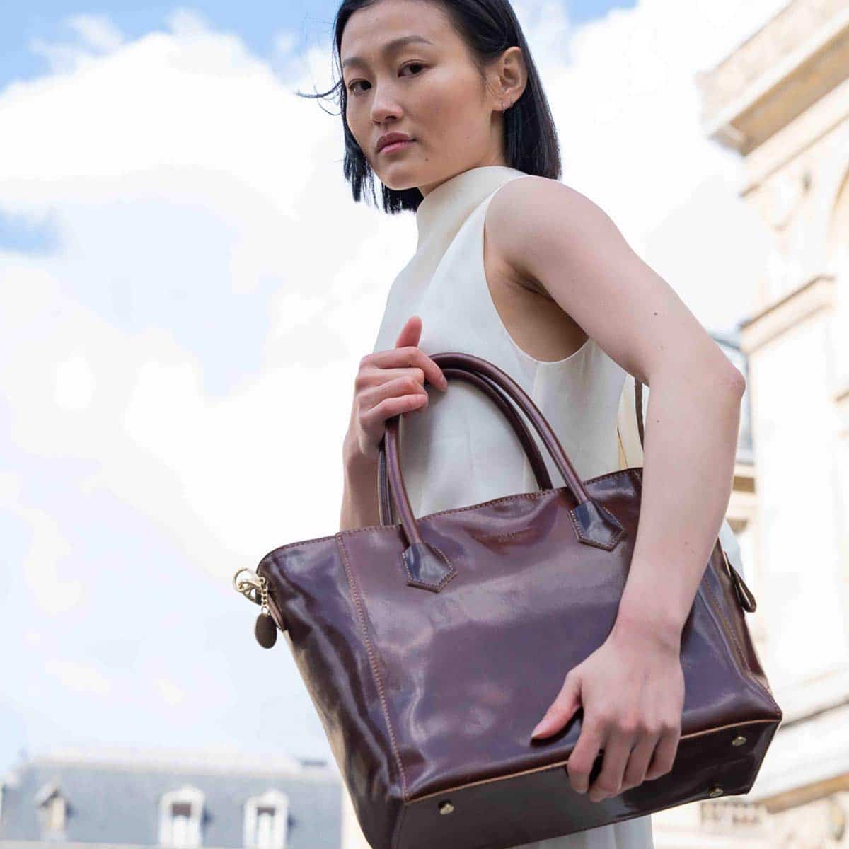 Le sac AURORA est un cabas en cuir de vachette lisse à la silhouette élégante et structurée.