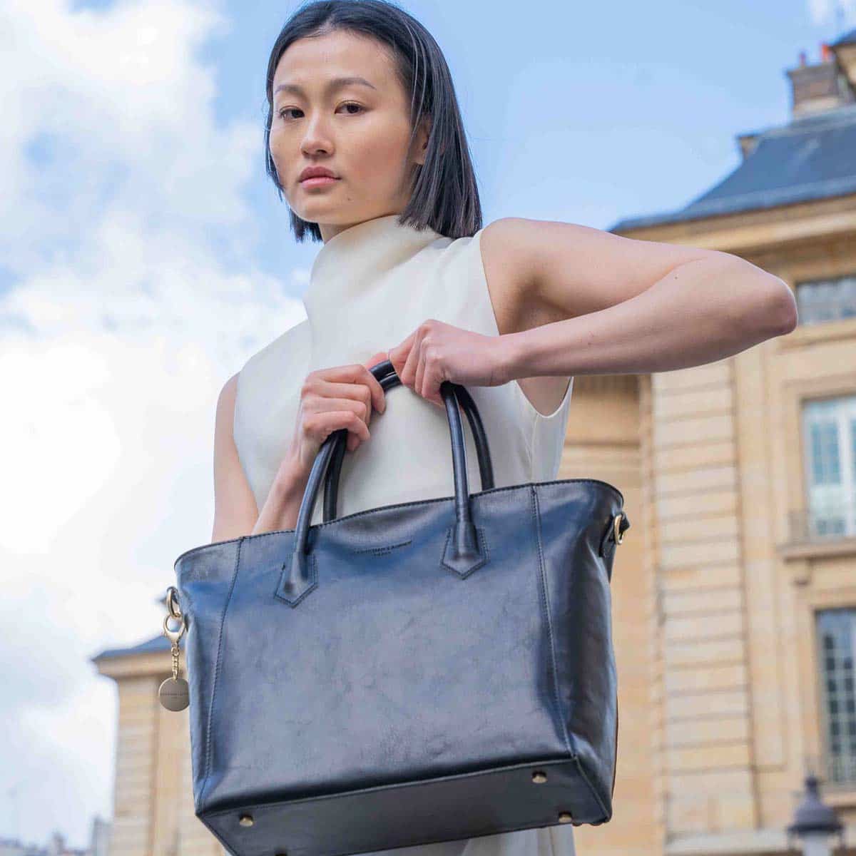 Ses anses rigides assurent une bonne tenue et un porté confortable à la main ou à l’avant-bras, tandis que son format généreux permet d’emporter facilement les essentiels du quotidien. Un modèle chic et intemporel, aussi adapté au travail qu’aux journées plus décontractées.