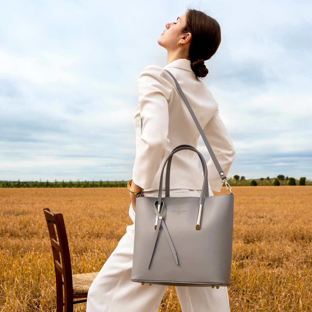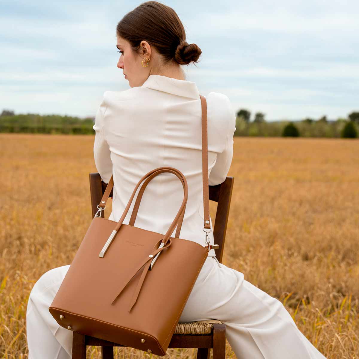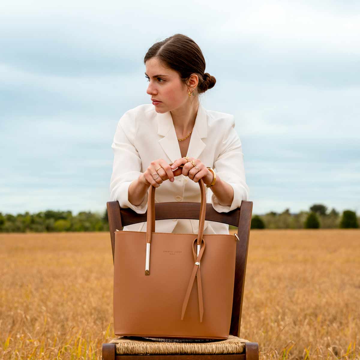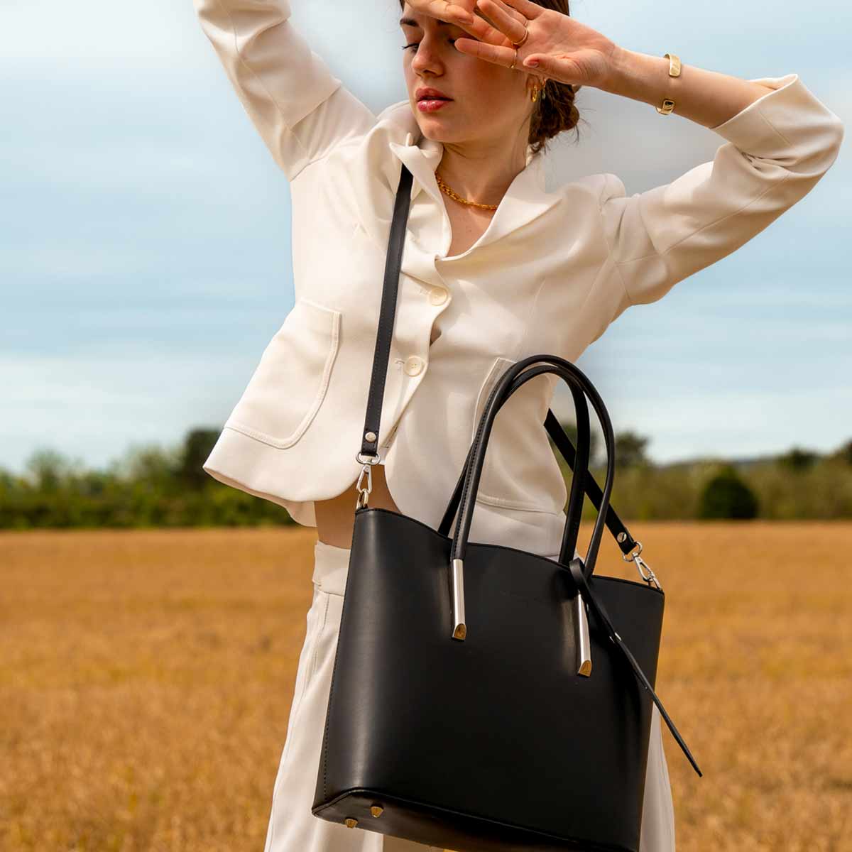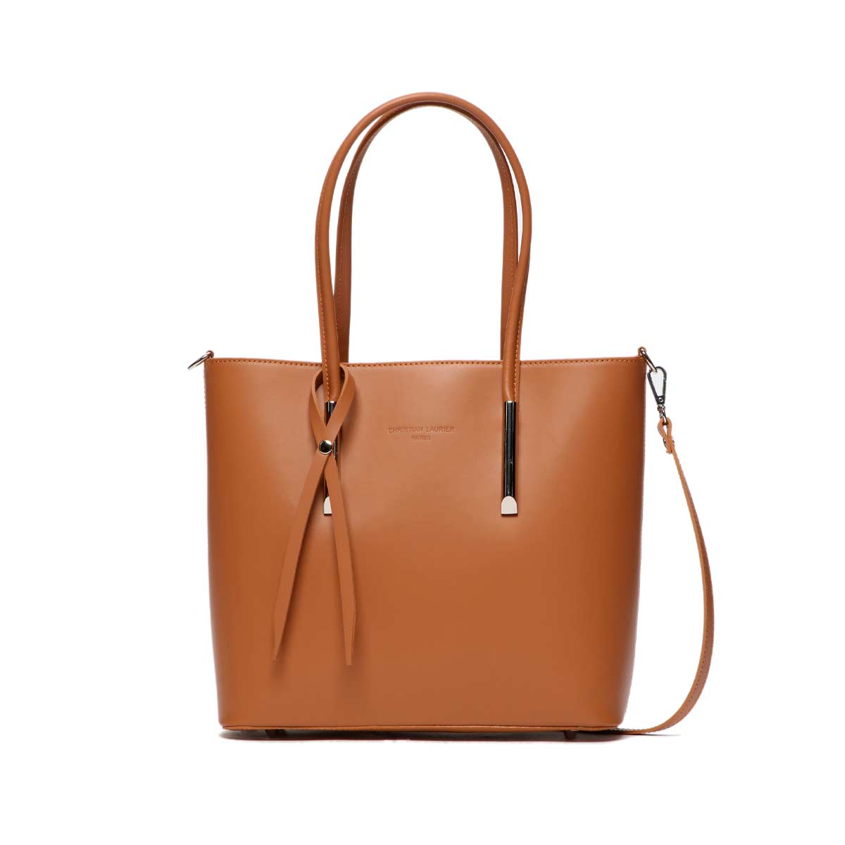 Sac à main en cuir, ouverture zippée. Intérieur : trois poches + poche zippée à l’arrière du sac. Vient avec sa bandoulière amovible.
