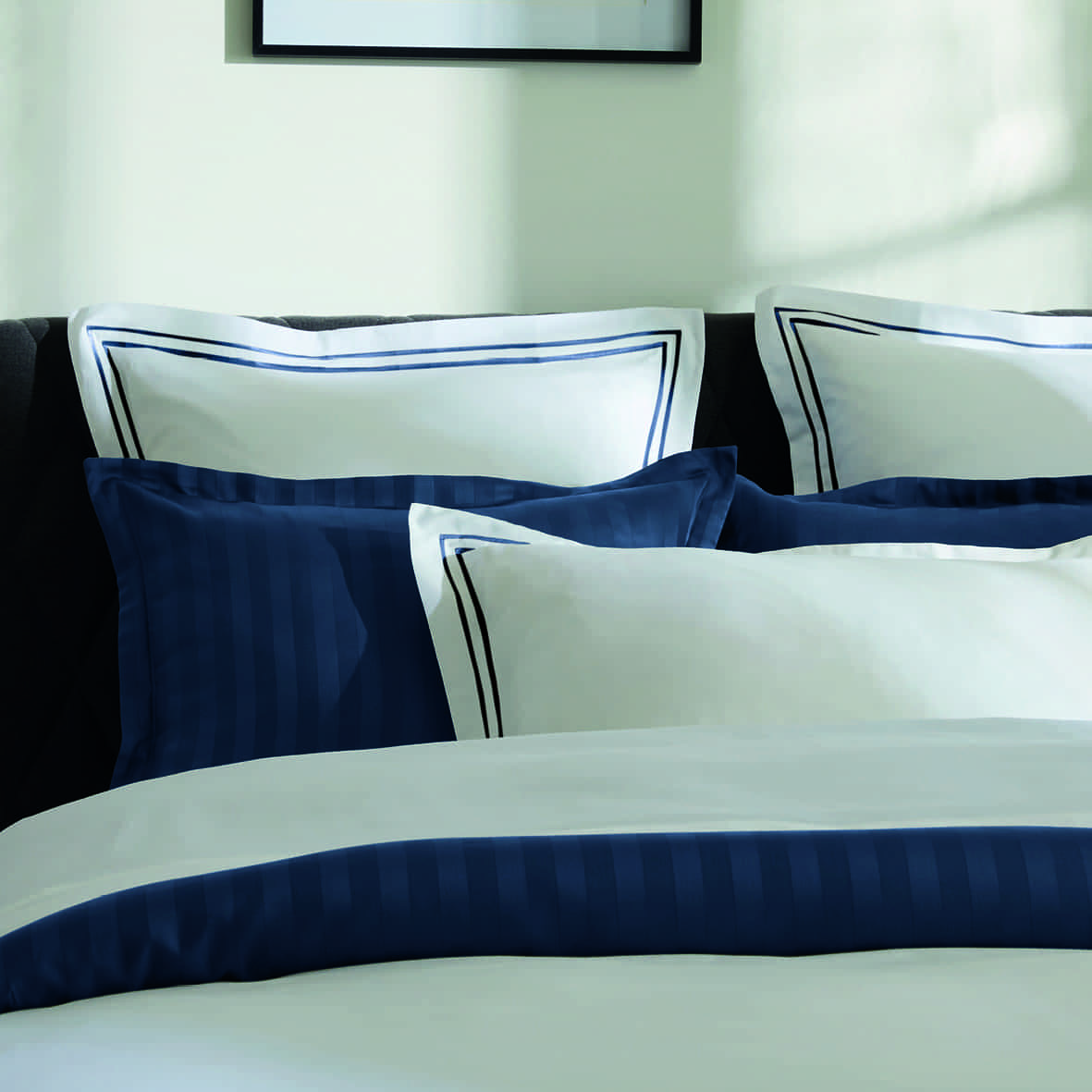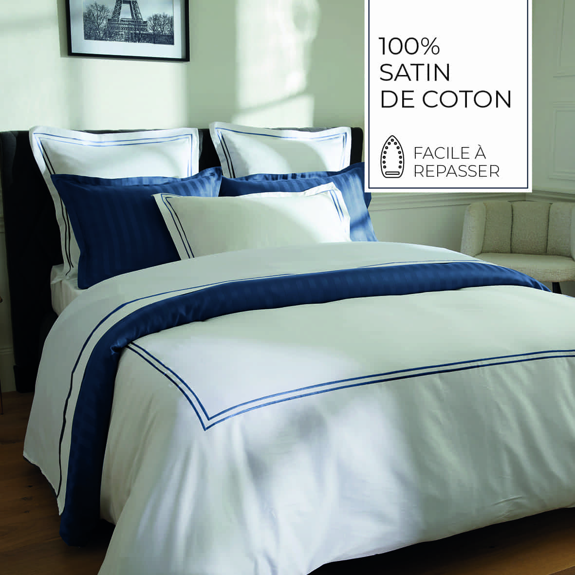 Housse de couette + taie d’oreiller satin de coton – Biarritz Bleu fonce / Blanc – 135 x 200 cm + 80 x 80 cm