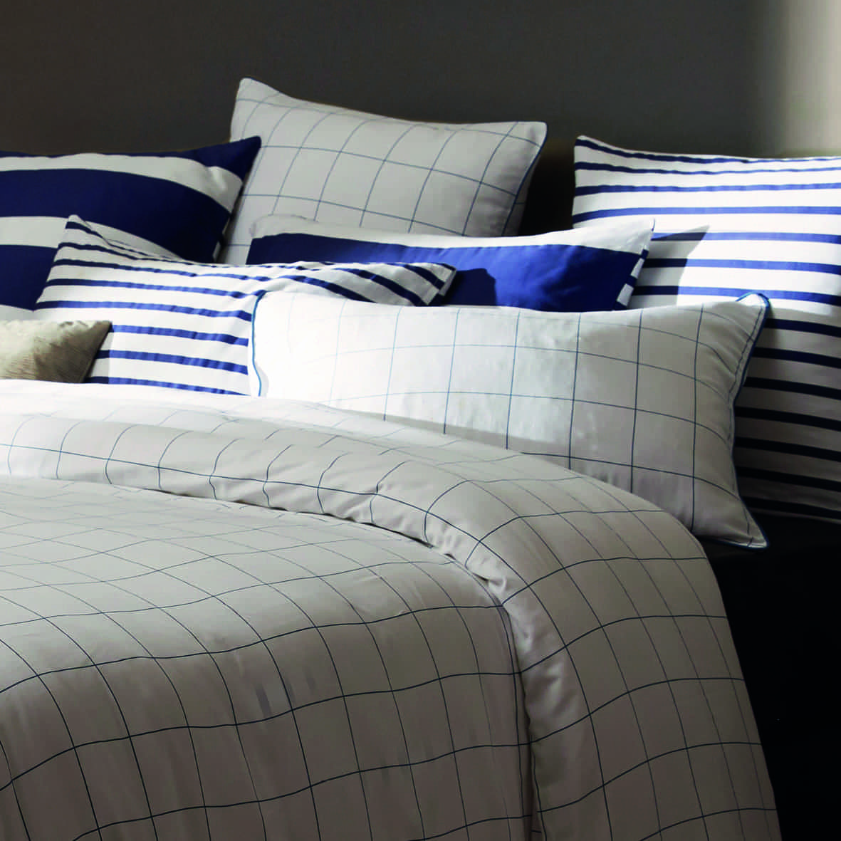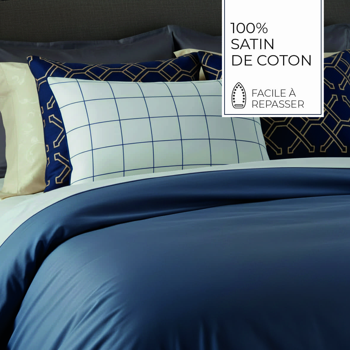 Set de 2 taies d’oreiller satin de coton – Simples carreaux Blanc / Bleu – 2 x (50 x 70 cm)